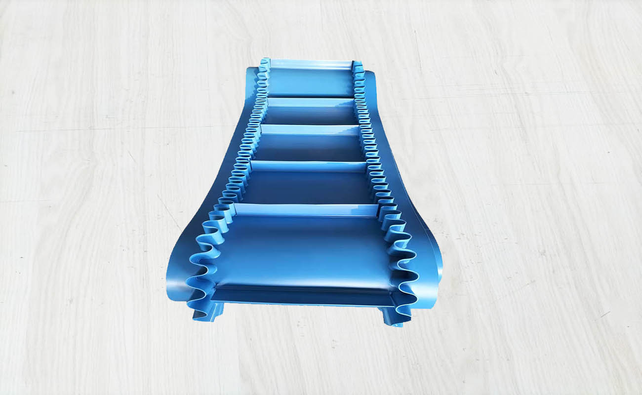 PU白色食品輸送帶(裙邊擋板帶),擋邊起防止物料測(cè)滑撒落的作用。為便于轉(zhuǎn)彎,裙邊設(shè)計(jì)成波紋狀;橫隔板的作用是承托物料,為了實(shí)現(xiàn)大傾角輸送,采用T型TC型。檔邊和橫隔板是用二次硫化的方法與基帶連接的,具有很高的連接強(qiáng)度。用于輸送易散落的粉狀、粒狀、小塊狀、糊狀及液態(tài)狀物料。