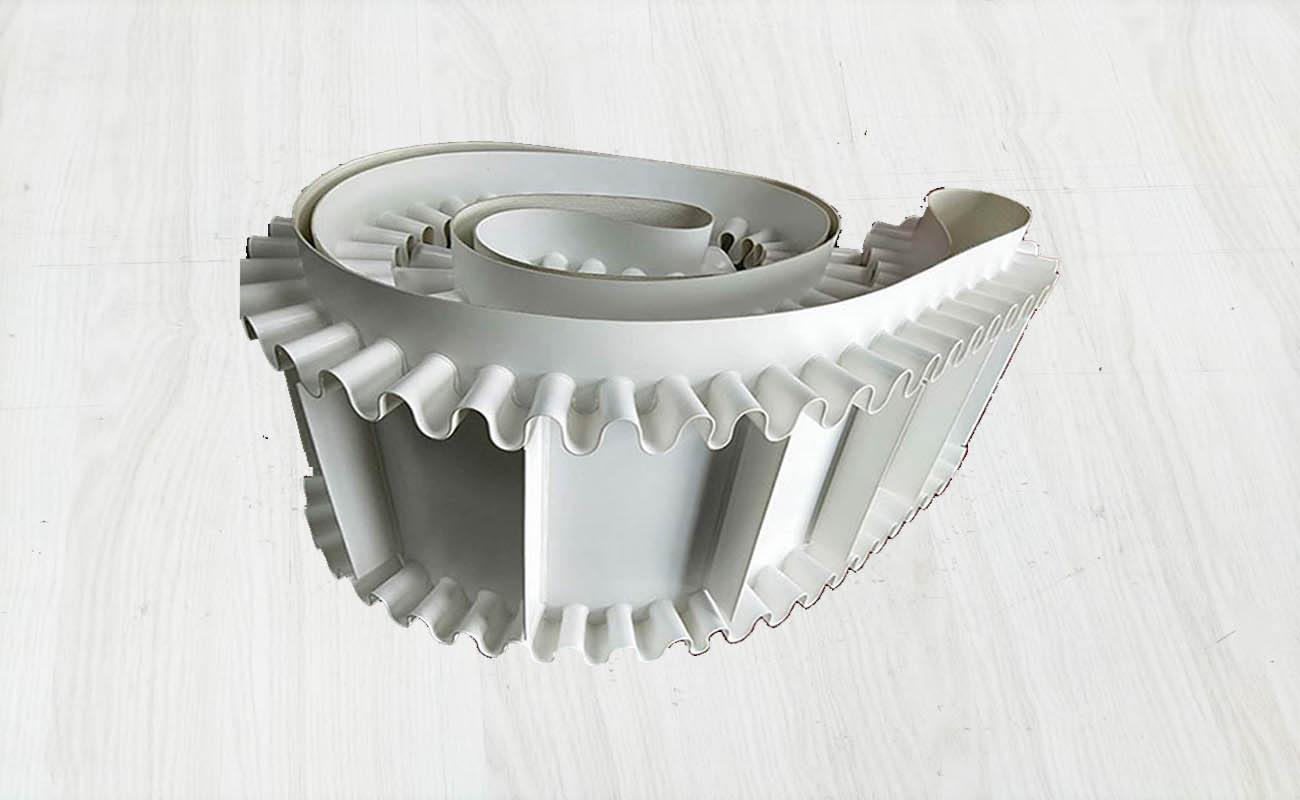 PU白色食品輸送帶(裙邊擋板帶),擋邊起防止物料測滑撒落的作用。為便于轉彎,裙邊設計成波紋狀;橫隔板的作用是承托物料,為了實現(xiàn)大傾角輸送,采用T型TC型。檔邊和橫隔板是用二次硫化的方法與基帶連接的,具有很高的連接強度。用于輸送易散落的粉狀、粒狀、小塊狀、糊狀及液態(tài)狀物料。